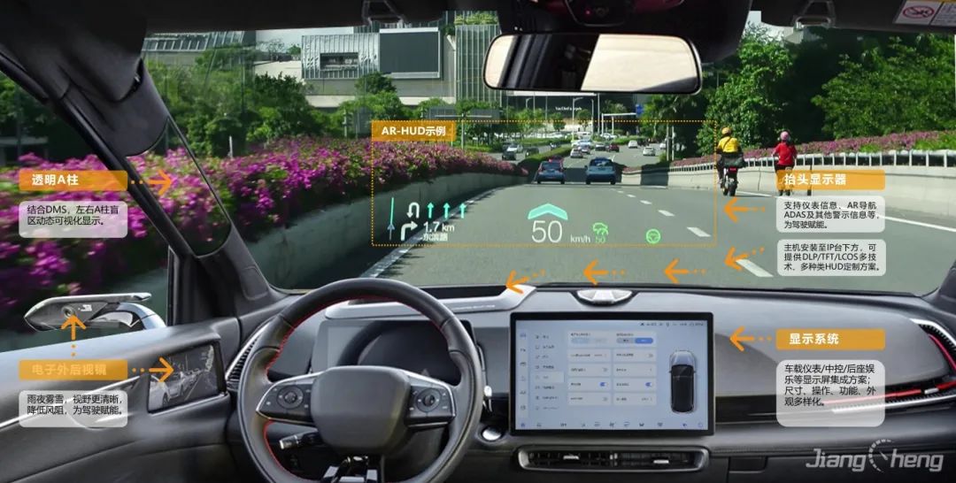 基于復雜變量環(huán)境完成大尺寸、小體積的光機設計,并采用多數(shù)據(jù)融合算法實現(xiàn)導航、ADAS等輔助駕駛信息在真實路況上的疊加、融合顯示,提升駕駛安全性的同時給予更酷炫、更智能的駕駛體驗。